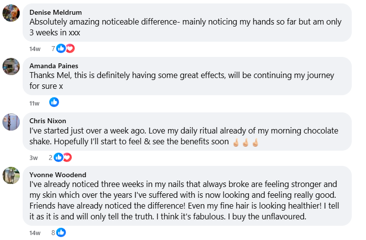 "As a 59 year old I started noticing my skin was looking worse and worse every passing month, so I jumped on collagen 2 months ago after seeing an ad on Facebook and since then I've noticed incredible improvements in my Skin! My hair also feels thicker & it now grows quicker!"
