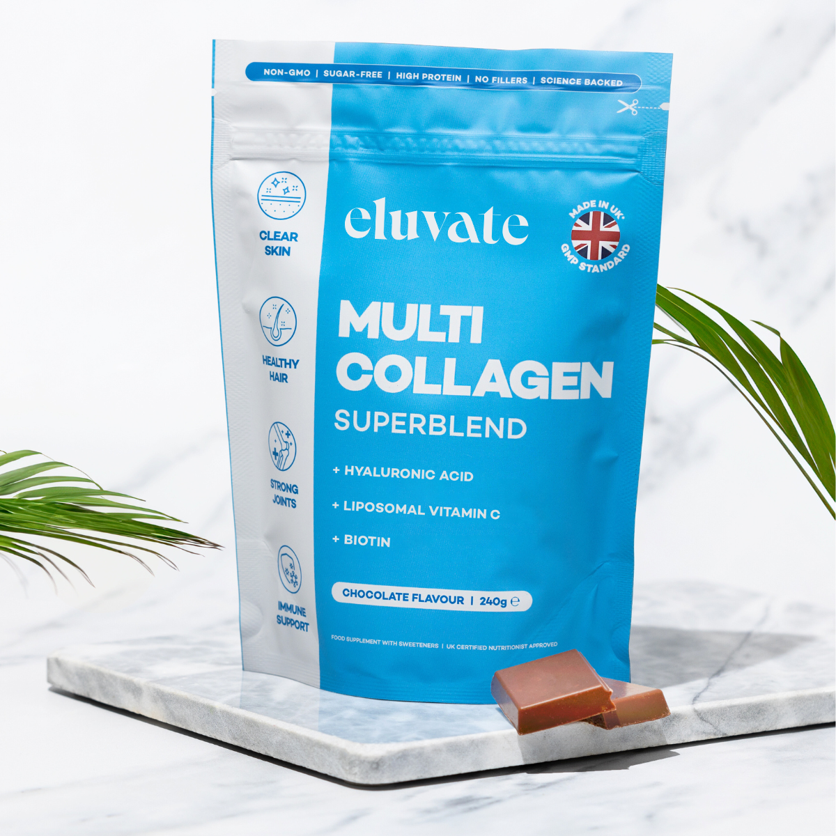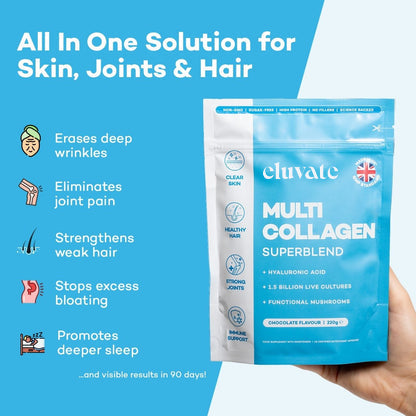 Eluvate Collagen is the ONLY joint-healing, wrinkle-reversing, chocolate flavoured powder that leverages 6 clinically-studied nutrients to stop and reverse the most stubborn signs of aging...
